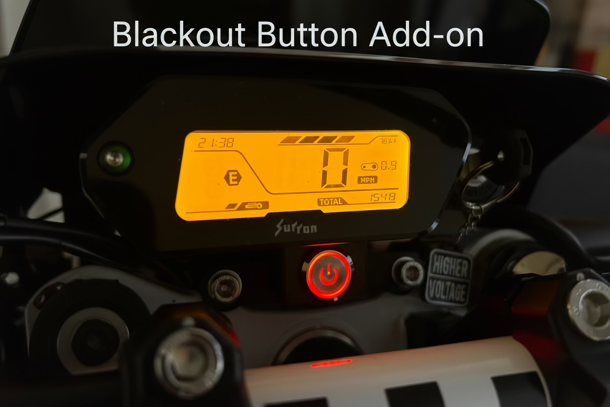 Optional Blackout Button Add-on: Waterproof blackout button that mounts right below the display. This button turns off the taillight function allowing you to go dark if ever needed, the brake lights will still illuminate when pressing the brake levers. The button will also blackout all accessories plugged into our HigherVoltageMoto harness like our plug and play wheelie light or our “coming soon” underglow.