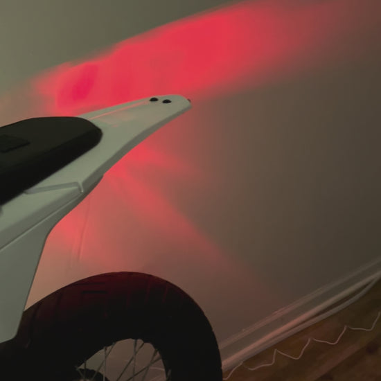 Modular plug and play brake light kit for the Surron Ultra Bee Off-Road model. No splicing wires, soldering or cutting plastic, just plug it in and route the wires. The taillight will turn on with the bike and the brake levers will brighten the brake light when pressed. It comes with a sleek, carbon fiber infused, taillight mount which perfectly mates to the Ultra Bee under-body. All wires are clearly labeled and simple to understand making it a quick and easy install. Each kit comes with (2) accessory connectors so you can easily add our plug and play wheelie headlight or any of our future plug and play accessories at any time.